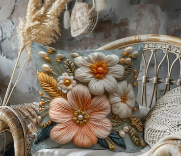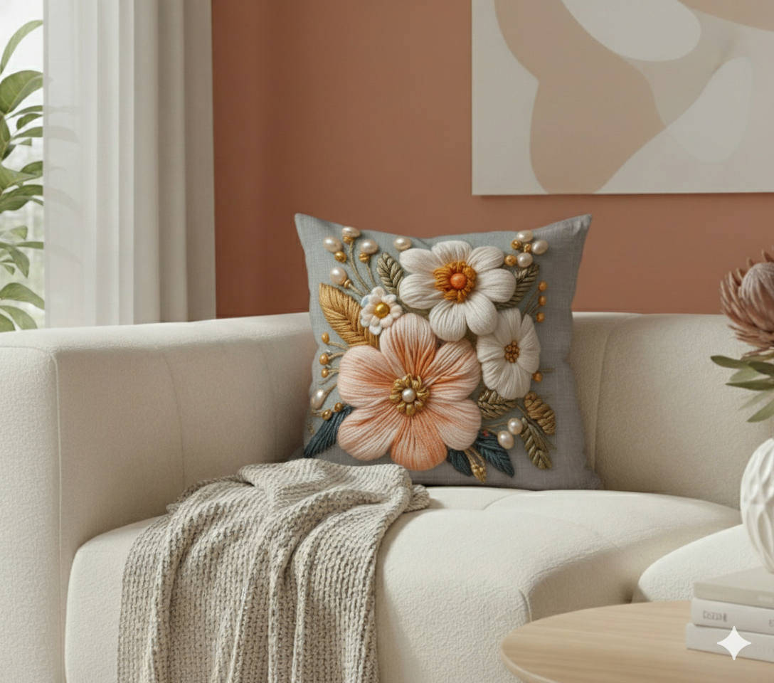 • İplik dokulu krem, beyaz ve mercan tonlarında çiçekler