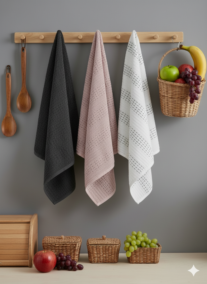 3’lü El ve Mutfak Havlu Setimiz, mutfaklarınıza hem işlevsellik hem de şıklık katmak için ideal bir tercihtir. Evinizin en işlek köşesine  zarif dokunuşunu ekleyin ve farkı hissedin.