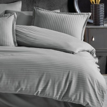 Açık gri pamuk saten çift kişilik nevresim takımı, sade ve modern rengi ile pamuk satenin yumuşak dokusunu bir araya getirerek konforlu bir uyku deneyimi sunar.