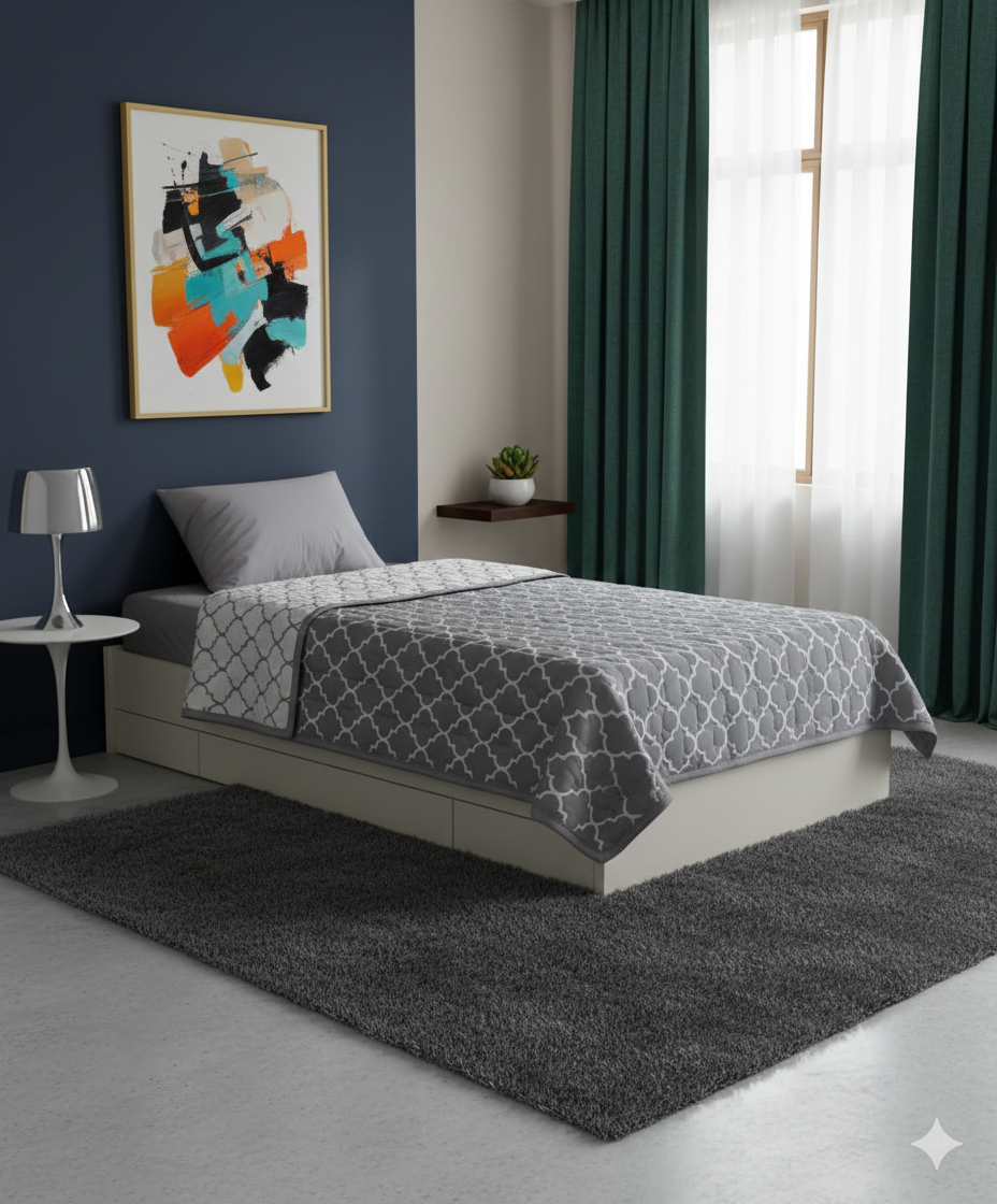 Antik desen gri kapitone sürpriz pike takımı tek kişilik, klasik antik desen detayları ve modern gri rengiyle yatak odalarında şık bir görünüm sunar.