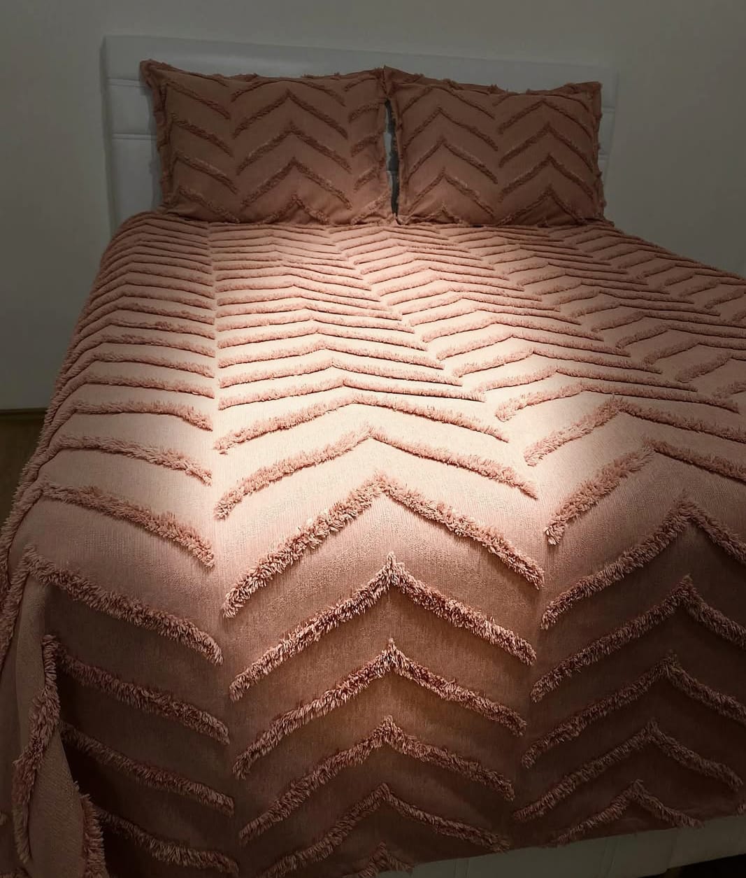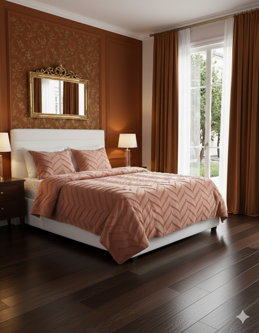 Sıcak tarçın rengi ve dekoratif ponpon detaylarıyla bu pike takımı, yatak odanıza estetik ve konforlu bir uyku ortamı sunar.