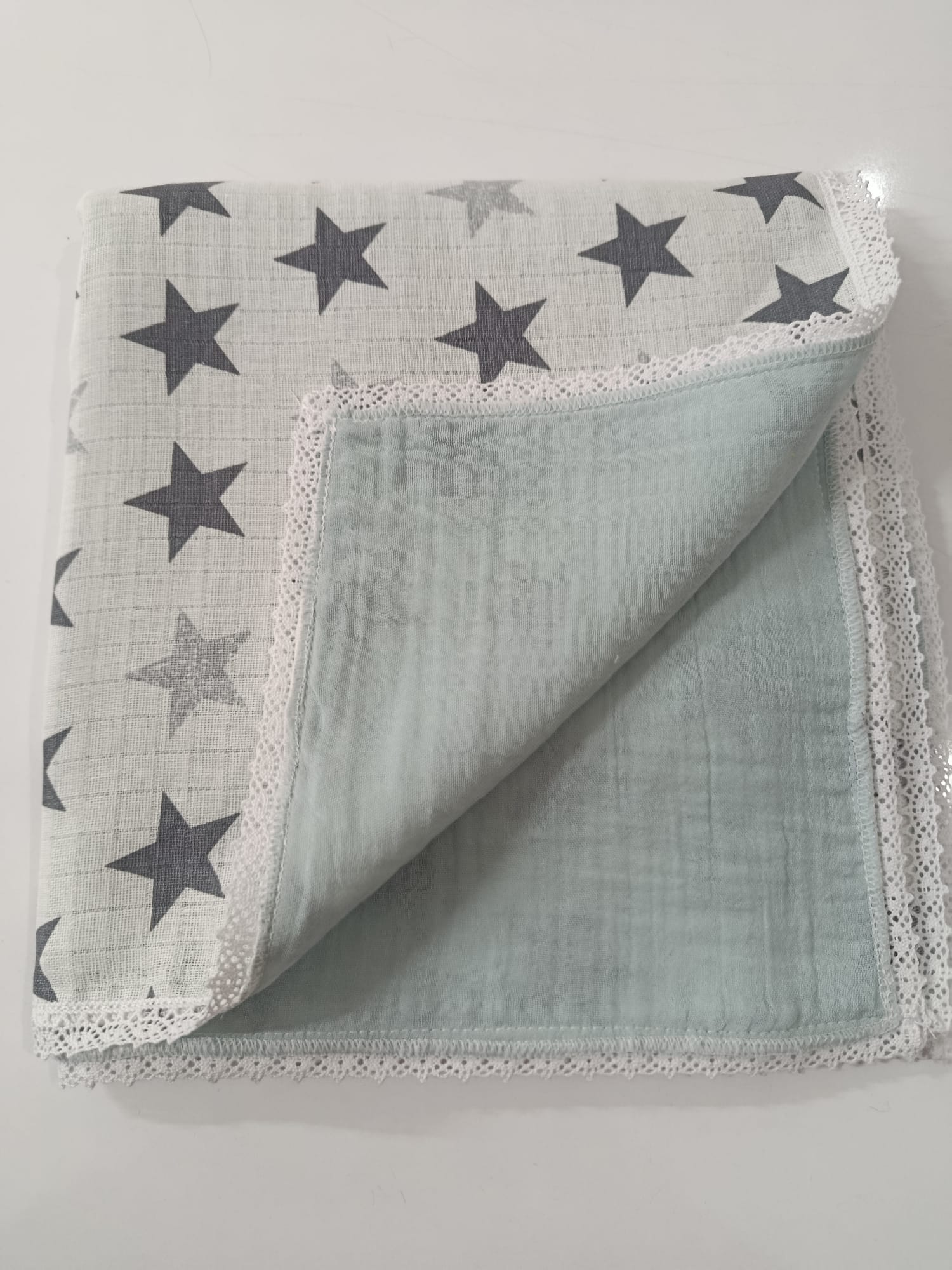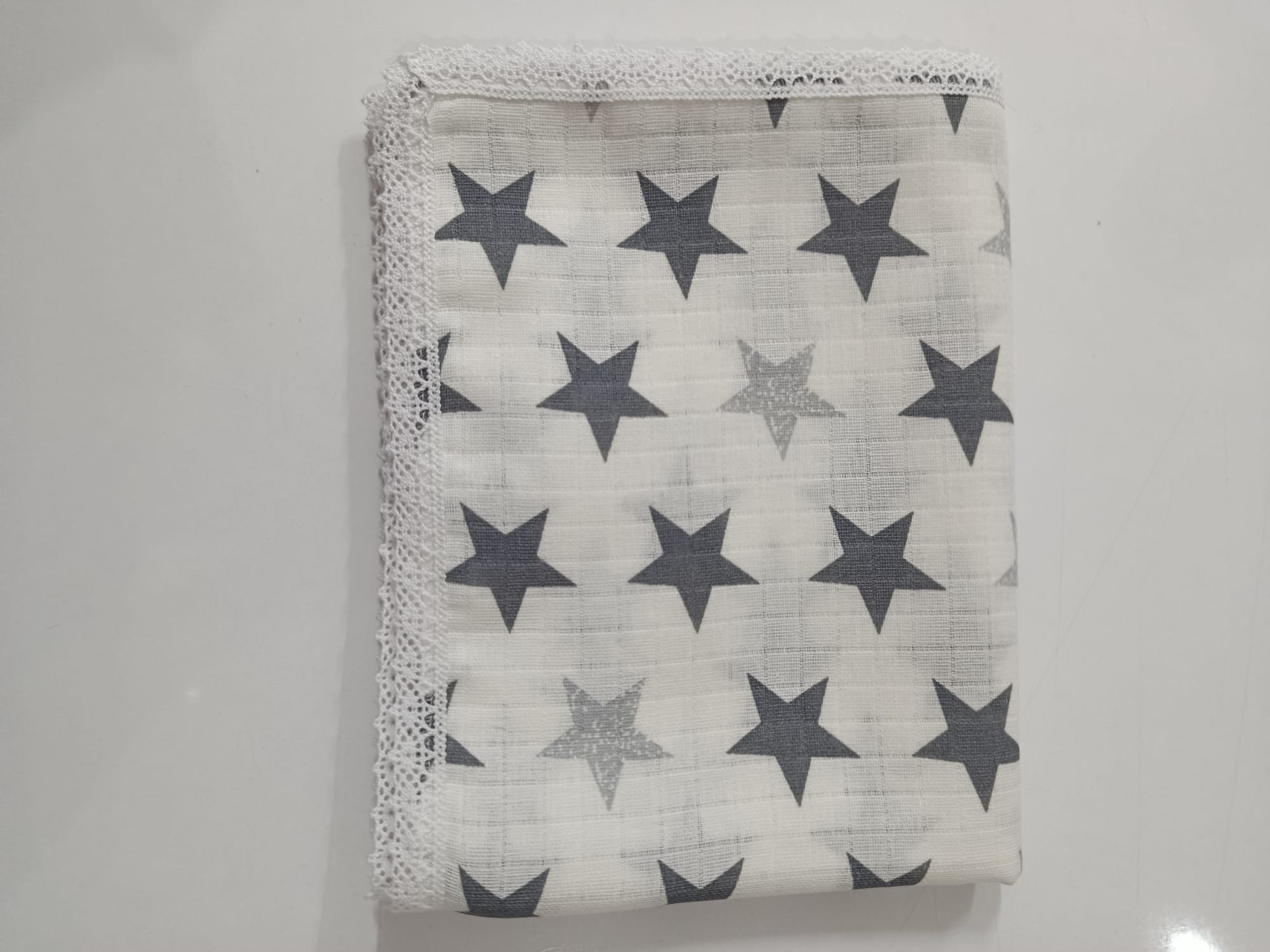 Yıldızlı Müslin Bebek Battaniye Ürünlerimiz %100 pamuk iplik kullanılarak özel bir teknikle dokunan müslin kumaştan üretilmiştir.